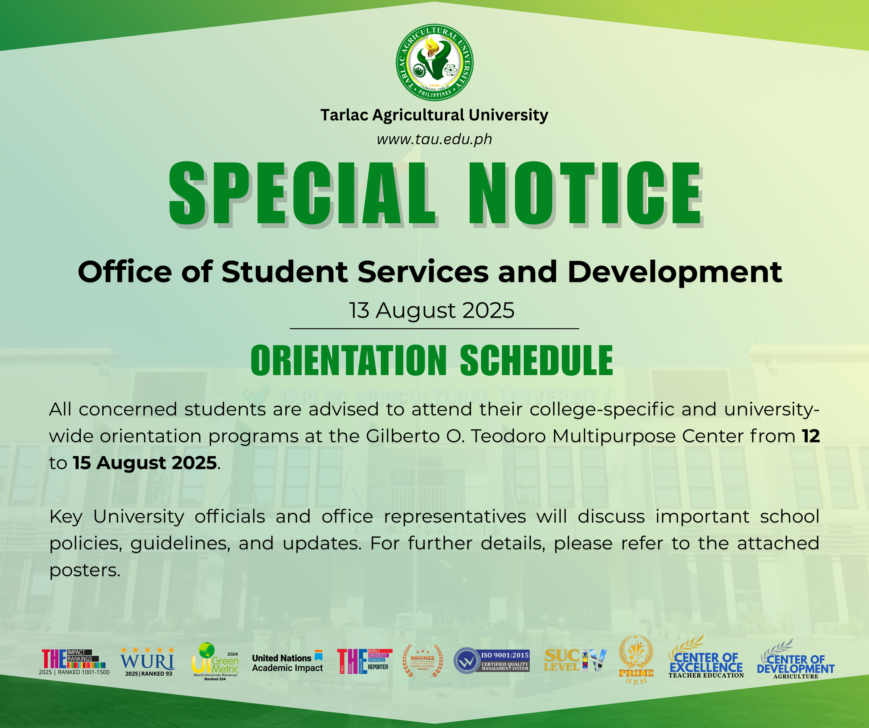 All concerned students are advised to attend their college-specific and university-wide orientation programs at the Gilberto O. Teodoro Multipurpose Center from 12 to 15 August 2025.