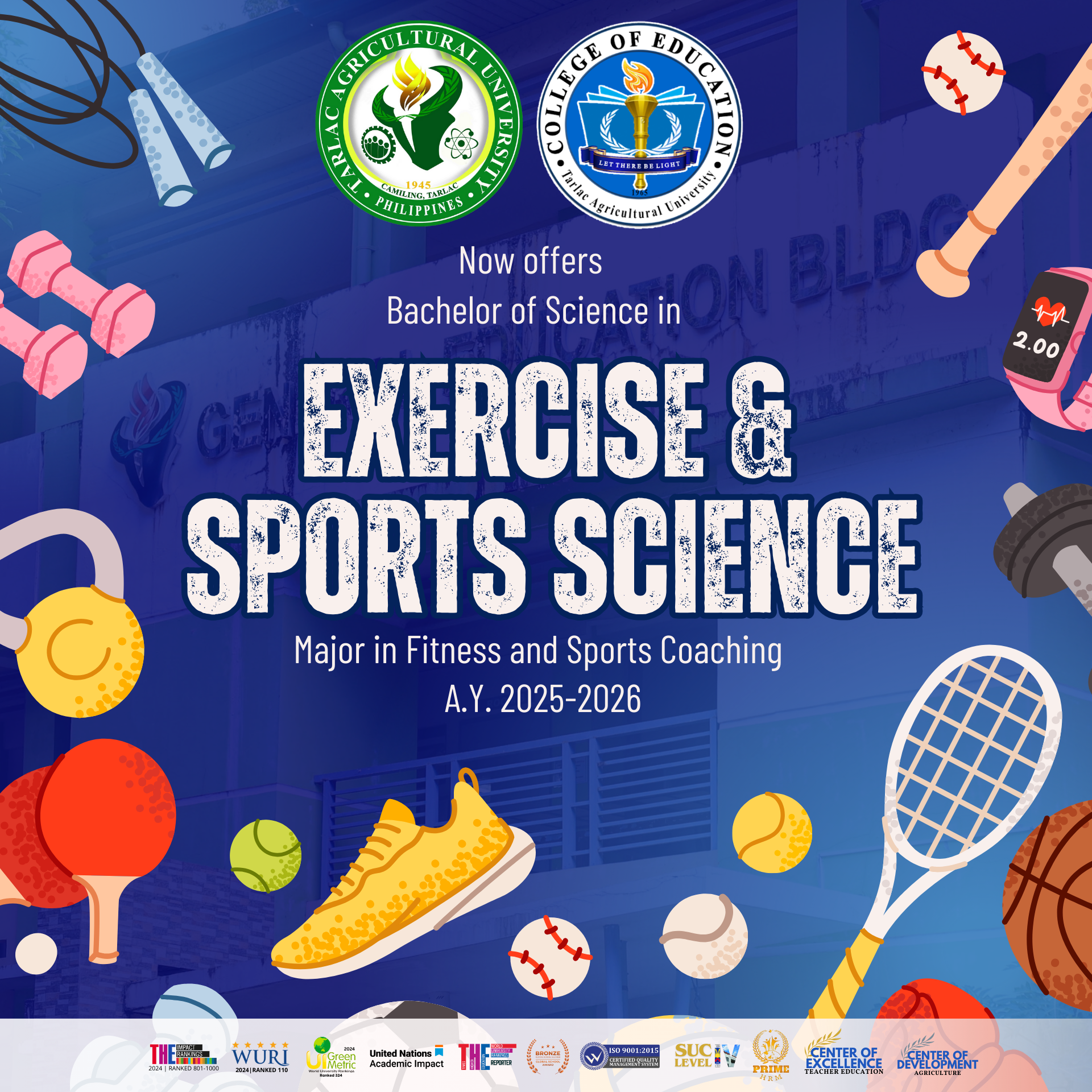 Capitalizing on its state-of-the-art sporting facilities and expert faculty, Tarlac Agricultural University (TAU), via its College of Education (CEd), has announced the launch of Bachelor of Science in Exercise and Sports Science (BSESS) major in Fitness and Sports Coaching program for the Academic Year 2025-2026.