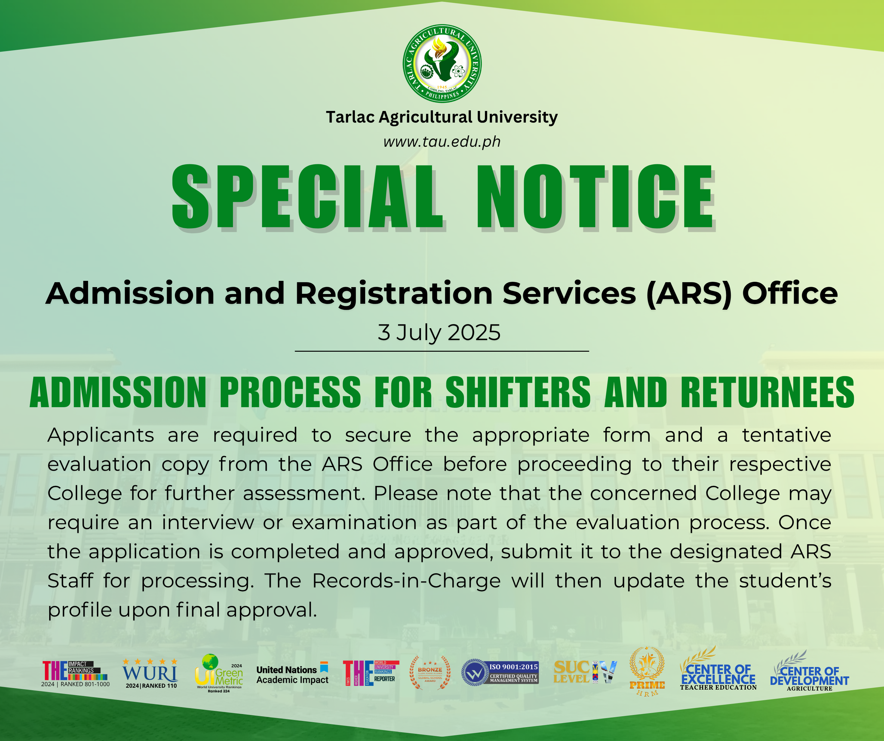 The Admission and Registration Services (ARS) will accept applications for shifters and returnees for the 1st Semester, AY 2025-2026, from 7–11 July 2025. Shifters must submit a duly accomplished Application for Shifting Form, while returnees must submit a duly accomplished Application for Re-admission Form.