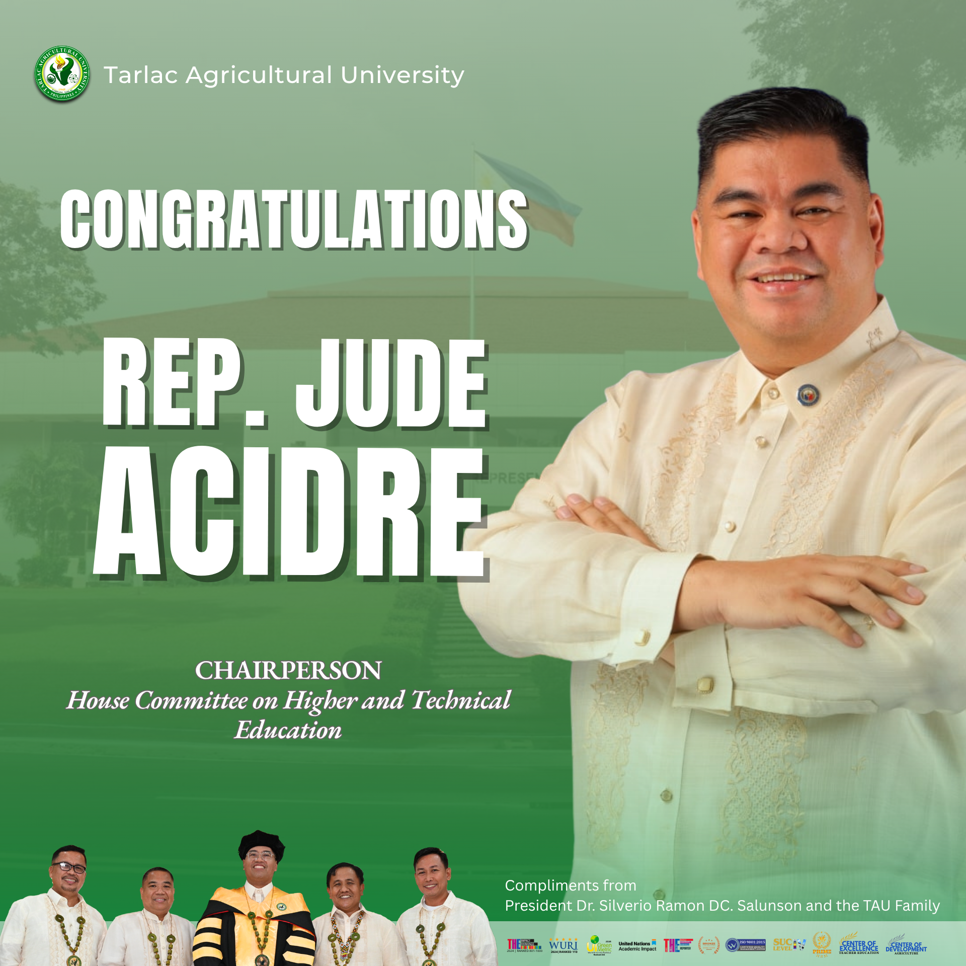 The Tarlac Agricultural University (TAU) community extends its warmest congratulations to Sen. Alan Peter S. Cayetano on his appointment as Chairperson of the Senate Committee on Higher, Technical, and Vocational Education, and to Rep. Jude A. Acidre on his assumption of the role as Chairperson of the House Committee on Higher and Technical Education.