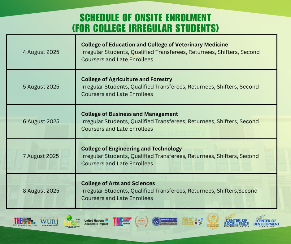 The TAU-Admission and Registration Services (ARS) Office announces the schedule of onsite enrollment for the First Semester of Academic Year 2025β2026. Continuing regular students from second year to sixth year are scheduled to enroll from July 30 to August 1, 2025. Meanwhile, irregular students are advised to complete their enrollment from August 4 to 8, 2025.
