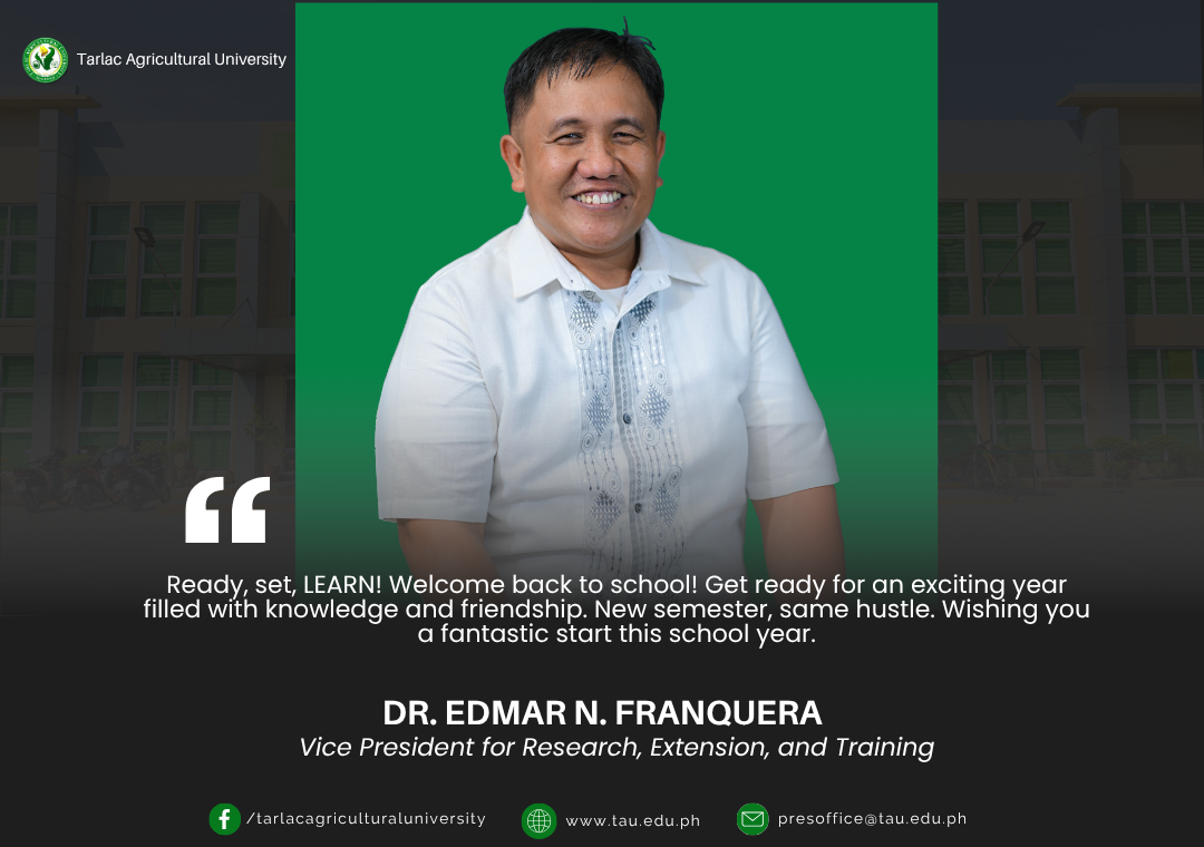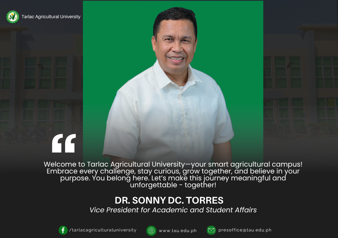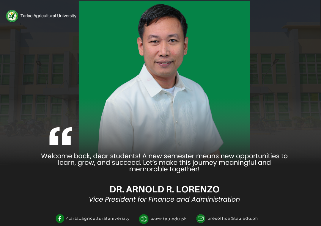 Joining Tarlac Agricultural University (TAU) President Dr. Silverio Ramon DC. Salunos in extending a warm welcome, the university's four Vice Presidents and six Deans greet all TAUians as they embark on the new academic year.