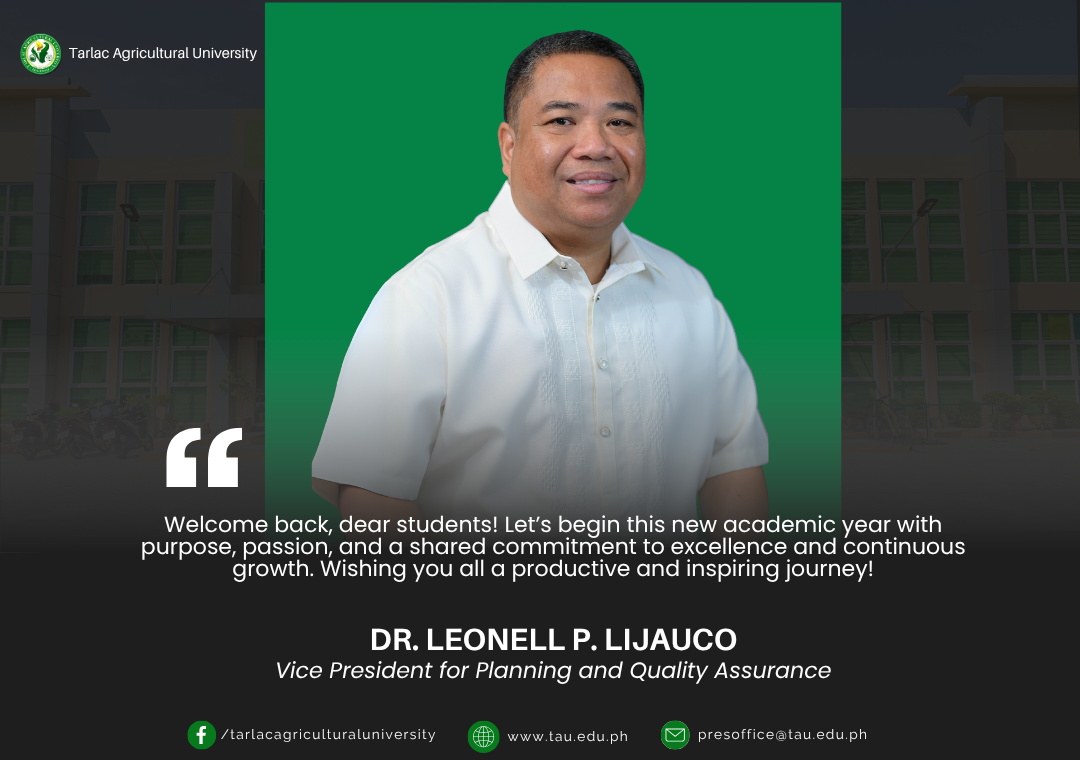 Joining Tarlac Agricultural University (TAU) President Dr. Silverio Ramon DC. Salunos in extending a warm welcome, the university's four Vice Presidents and six Deans greet all TAUians as they embark on the new academic year.