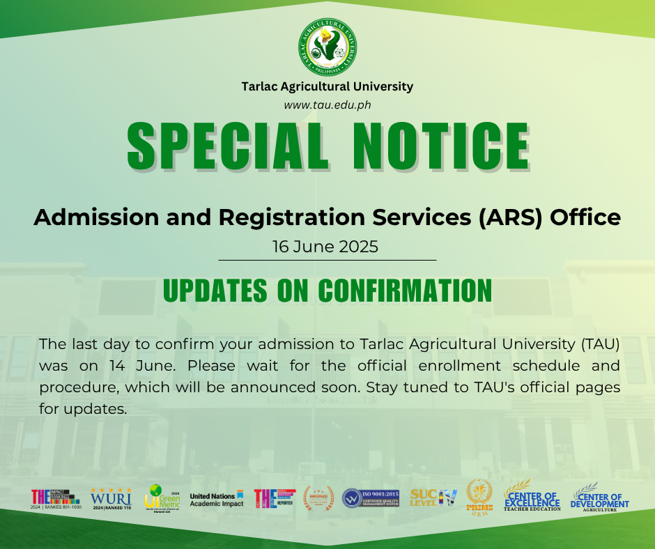 The last day to confirm your admission to Tarlac Agricultural University (TAU) was on 14 June. Please wait for the official enrollment schedule and procedure, which will be announced soon. Stay tuned to TAU's official pages for updates.