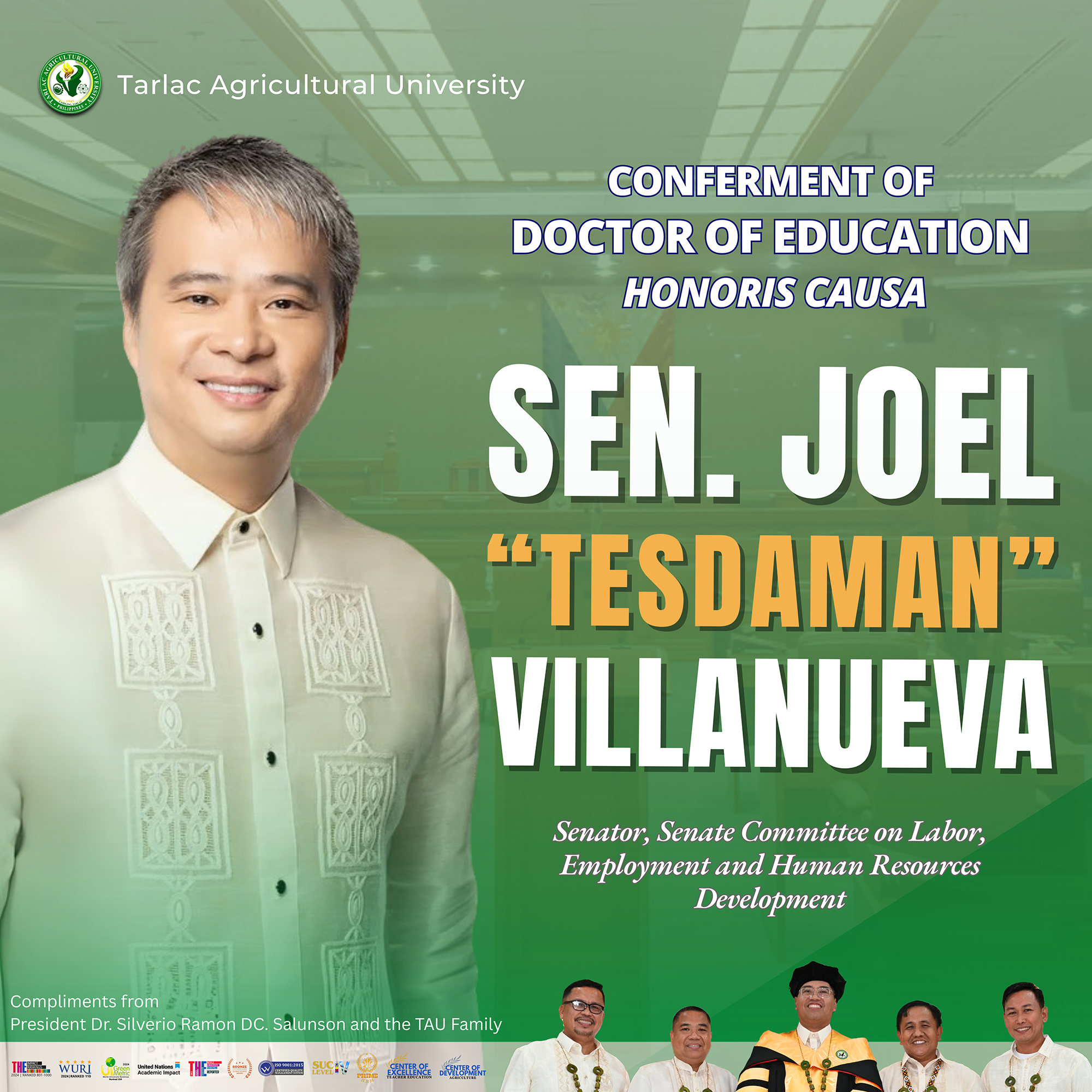 The Tarlac Agricultural University (TAU) proudly announces the Conferment of the Doctor of Education, honoris causa, degree upon Senator Joel “TESDAMAN” Villanueva, Chairperson of the Senate Committee on Labor, Employment, and Human Resources Development. The bestowal ceremony will be held alongside TAU’s 79th Commencement Exercises on 5 June 2025.