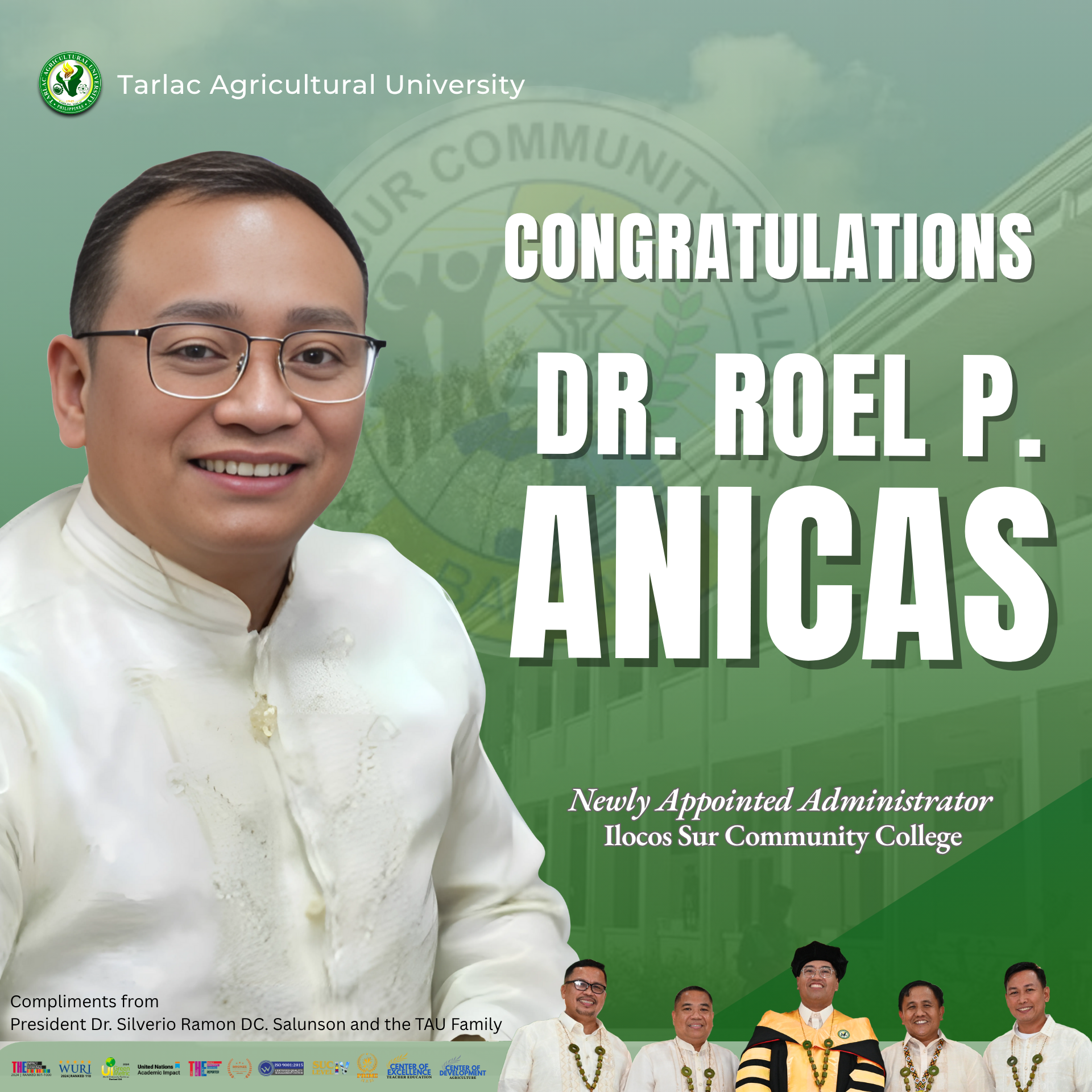 The Tarlac Agricultural University (TAU) family extends its sincerest greetings to Dr. Roel P. Anicas, former Education Supervisor II of the Commission on Higher Education Regional Office (CHEdRO) III, on his well-deserved appointment as Administrator of Ilocos Sur Community College (ISCC)!