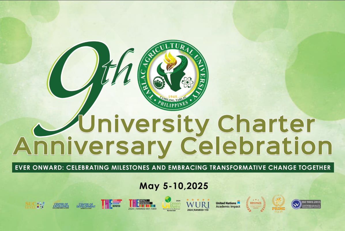 Tarlac Agricultural University warmly invites all TAUian students, employees, alumni, and partners to join its 𝟗𝐭𝐡 𝐂𝐡𝐚𝐫𝐭𝐞𝐫 𝐀𝐧𝐧𝐢𝐯𝐞𝐫𝐬𝐚𝐫𝐲 𝐂𝐞𝐥𝐞𝐛𝐫𝐚𝐭𝐢𝐨𝐧 from 5 to 9 May, with the theme “Ever Onward: Celebrating Milestones and Embracing Transformative Change Together.” A week of meaningful activities awaits, including the Agri-Trade Fair, Ecumenical Service, Convocation Program, Fun Run, College Quiz Bee, Thanksgiving Fiesta, and more.